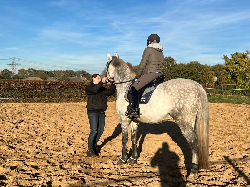 Bij het juiste bit merkte we dat Otto meer ontspannen is en gemakkelijker ‘laag’ wil lopen. Daarnaast kijkt Riekie naar het hoofdstel en het optimaal afstellen van het hoofdstel op het hoofd van het paard.